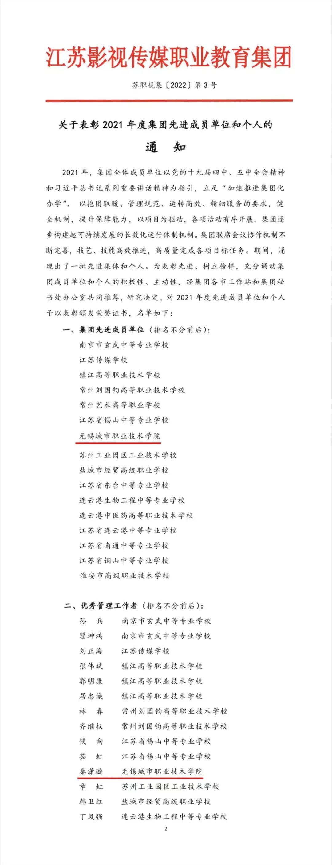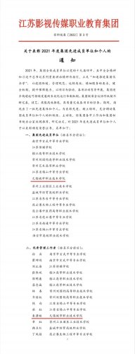 日前,江苏省影视传媒职业教育集团印发《关于表彰2021年度集团先进成员单位和个人的通知》,我校影视学院荣获“集体先进成员单位”称号,影视学院秦潇璇院长荣获“优秀管理工作者”称号,表彰如下: